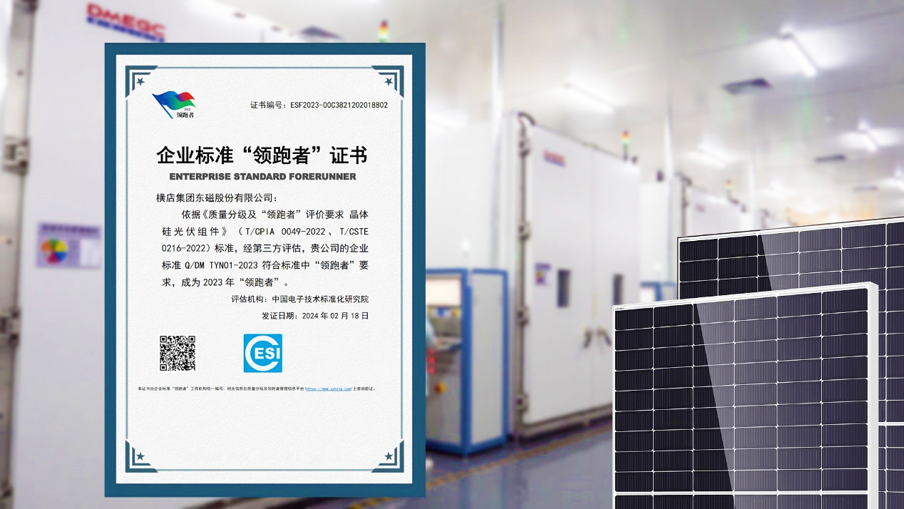 克日,横店stake官网依附在光伏行业制订的高水平标准,喜获由中国电子手艺标准化研究院揭晓的2023年度企业标准“领跑者”证书,成为业内首批十家“领跑者”之一。