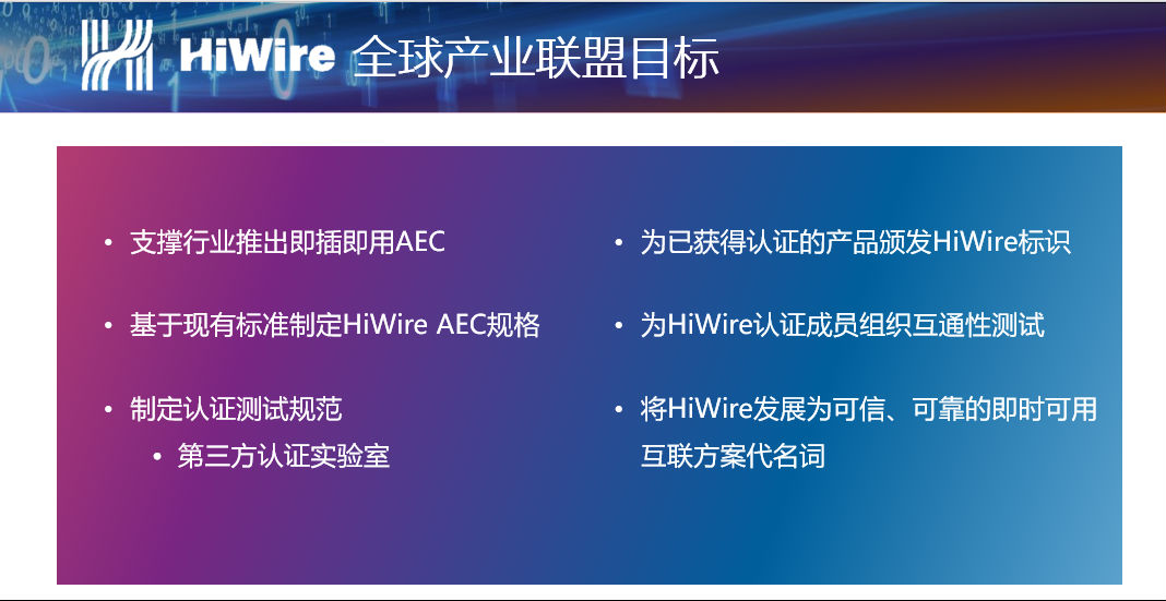 HiWireÖÂÁ¦ÓÚ½¨ÉèºÍÒ»Á¬¿ª·¢AEC±ê×¼£¬¸Ã±ê×¼½ç˵ÁËÖÚ¶àÒµ½ç¶àԴЭÒé(multi-source agreements£¬MSAs)µÄÏêϸʵÑéÒªÁìºÍÕýʽµÄÈÏÖ¤Àú³Ì¡£2019Äê9ÔÂÓÉCredo¡¢Keysight¡¢DellEMCµÈ28¼ÒÀ´×ÔÔÆ·þÎñÌṩÉÌ¡¢·þÎñÆ÷ÌṩÉÌ¡¢¸ßËÙ½»Á÷»úоƬ¡¢´«ÊäоƬ¡¢¹âÄ £¿é¡¢¹âµçÅþÁ¬Æ÷µÈÈ«¹¤ÒµÁ´³ÉÔ±ÅäºÏÌᳫ£¬ÖÂÁ¦ÓÚÔö½ø¸ßÖÊÁ¿¡¢¿É¼æÈݵÄHiWireTM AEC×°±¸¿ª·¢£¬Ìá¸ß¹«ÖÚÈÏÖª²¢Òý·¢ÖÕ¶ËÓû§¶ÔHiWireTM AECʹÓÃÐèÇó£¬Îª³¬´ó¹æÄ£Êý¾ÝÖÐÐÄ¡¢µçÐÅºÍÆóÒµÊг¡Ìṩ¶àÔ´ÇÒ¿É¿¿µÄ¼´²å¼´ÓÃAECÉú̬ϵͳ¡£