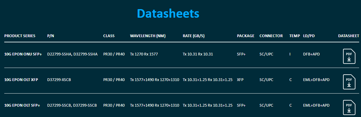 Compliant with IEEE 802.3ah/802.3av or ITU T 984.2/987.2/9807.1, RoHS, Class 1 laser safety certified by TUV/UL/FDA